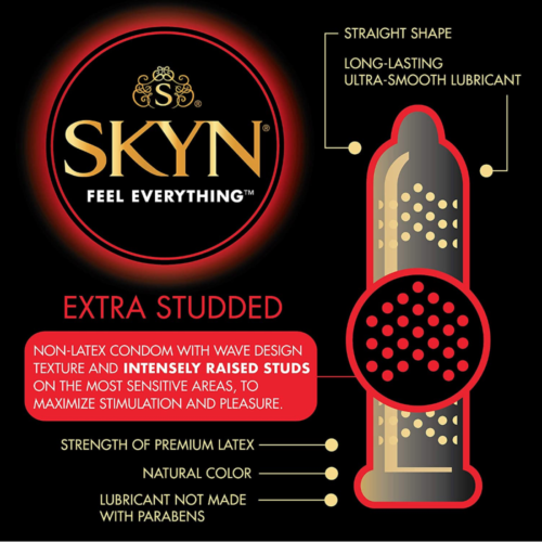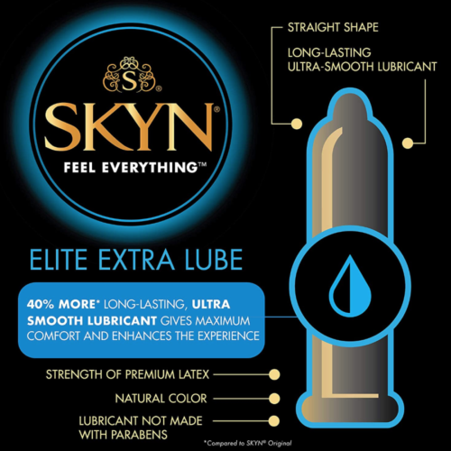 - SKYN Extra Lubricated: Features 40% more long-lasting ultra-smooth lubricant enhances the sexual experience