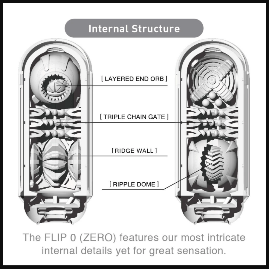 An outer layer covers the end orb which stimulates from all angles. Includes Tenga FLIP ZERO, sample lubricants, and a clear case for storage/drying.Flip-open design makes it fast and easy to clean and allows for faster drying.