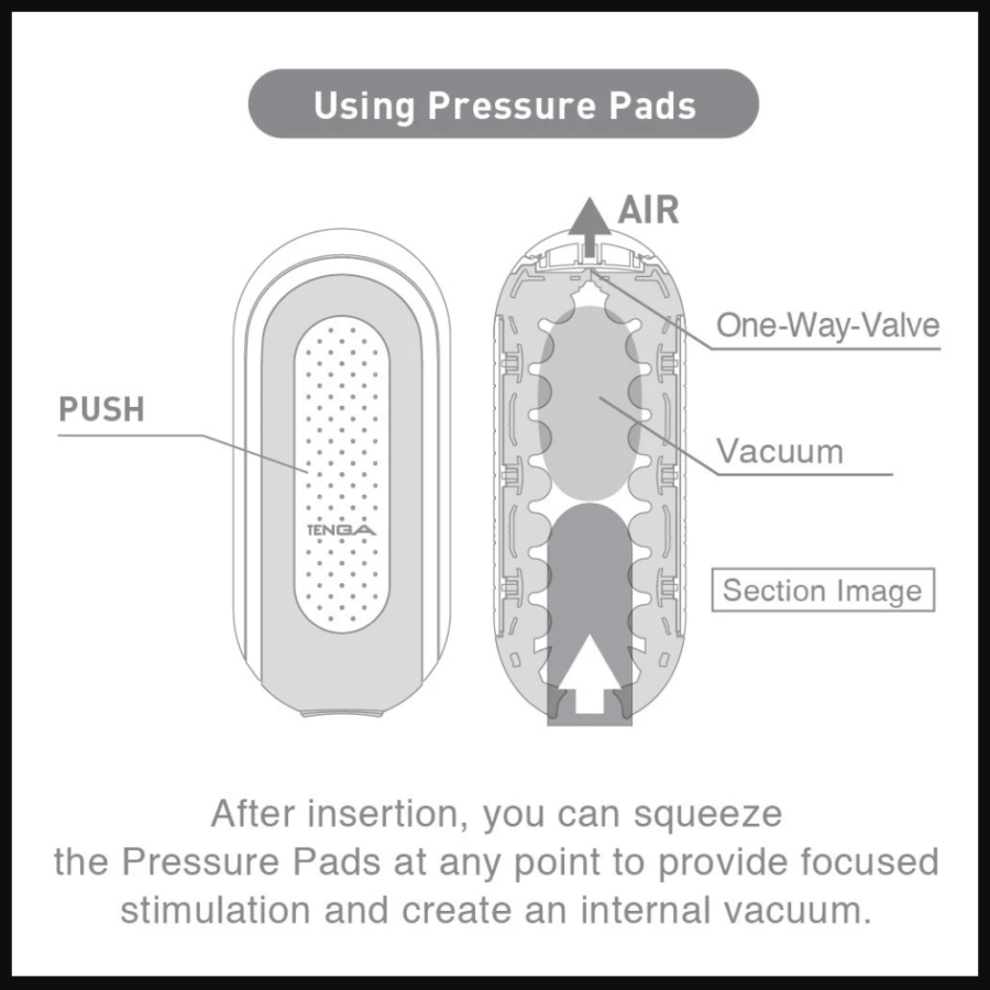 The seamless insertion point provides the perfect seal, preventing lubricant leakage and forming a strong vacuum made possible the one-way valve. Easier to hold and use than the standard Flip Hole, the Flip Zero's pressure pads are soft to the touch and allow for greater stimulation.The Flip Zero is also a great way to build stamina.