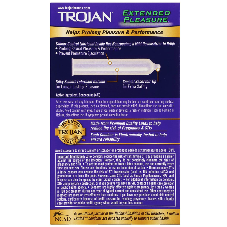 - One 12 count box of Trojan Extended Pleasure Condoms with Climax Control Lubricant