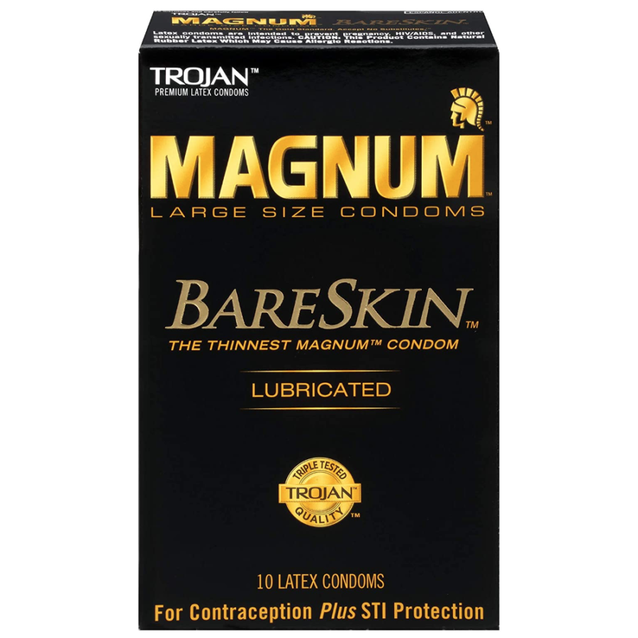 The Trojan Magnum Bareskin Lubricated Condoms are designed to provide heightened sensitivity and comfort. Magnum Bareskin Condoms are 20% thinner and 18% wider toward the tip than regular MAGNUM lubricated condoms.The thinnest MAGNUM condom, designed to provide heightened sensitivity and comfort.