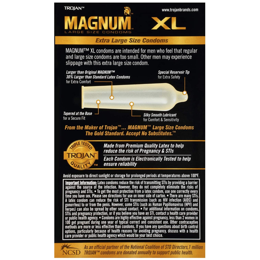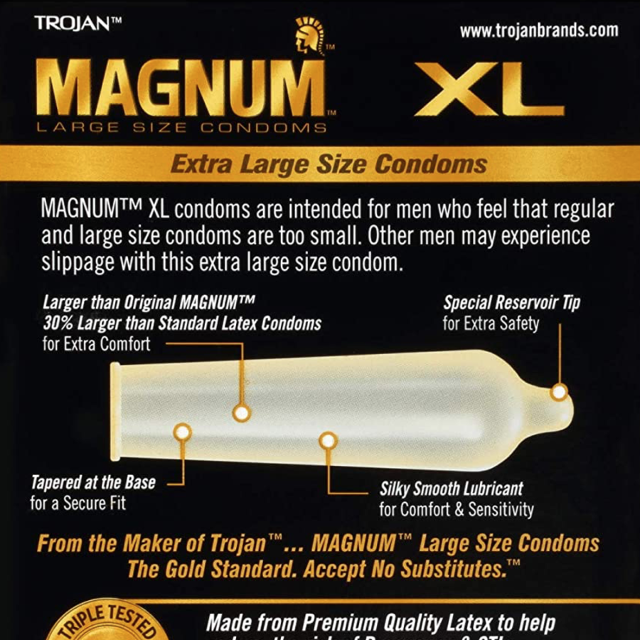 Trojan Magnum XL Lubricated Condoms are intended for men who feel that current regular and large size condoms are too small. Other men may experience slippage with this extra large size condom. The Gold Standard in comfort and protection.