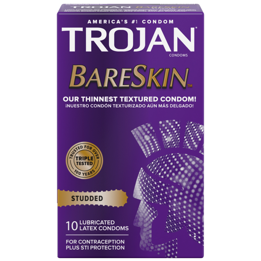 Experience the best of both worlds with Trojan Studded Bareskin Lubricated Condoms. The thin design provides ultimate sensitivity while elevated studs throughout the condom offer extra stimulation. The comfort condom shape offers a roomy design and the silky smooth lubricant enhances comfort and sensitivity. They’re made from a premium quality latex and are electronically tested to help ensure reliability.- One 10 count box of Trojan Studded Bareskin Lubricated Condoms